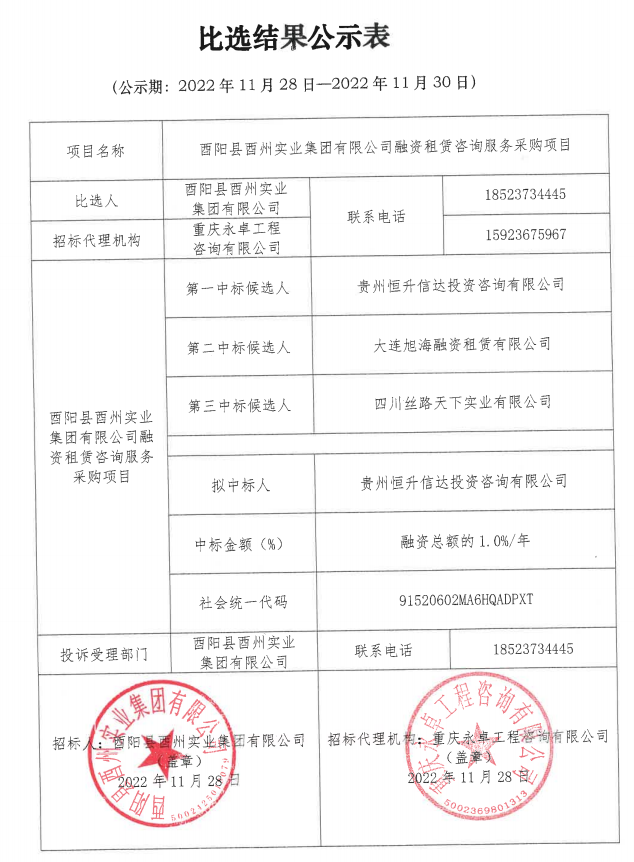 酉陽縣酉州實業(yè)集團有限公司融資租賃咨詢服務采購項目比選結(jié)果公示表