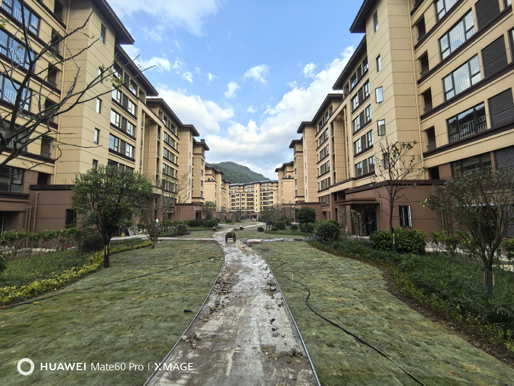 已完成景觀大門、景觀墻、景觀廊架,苗木綠化栽植完成58%,室外電氣完成50%,給排水管網(wǎng)安裝完成80%,鋪裝完成40%。